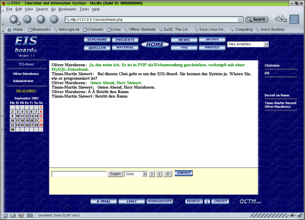 Ist der Termin zum Chat erreicht, so eröffnet der Lehrende zur festgesetzten Zeit einen neuen Chatraum (im Beispiel "DI") und wartet, dass die Studierenden eintreffen. Sie können sich dann ebenfalls in diesen Chatraum begeben. Auf diese Weise kann ein seminarspezifischer Chat durchgeführt werden.