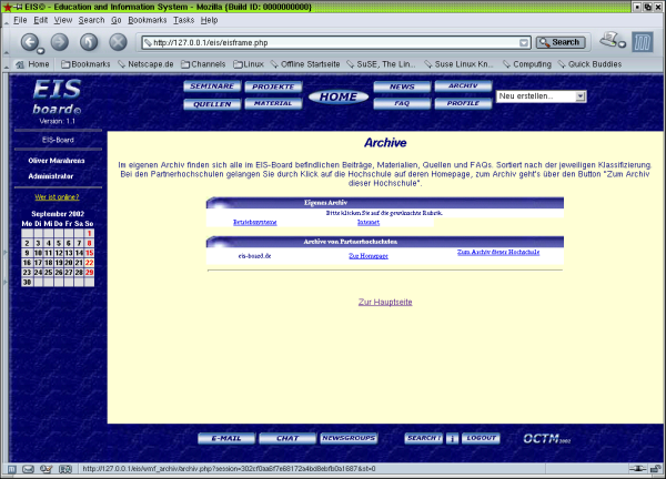 Im Archiv sind alle Datensätze aufbewahrt, sortiert nach Kategorien, in die die Datensätze beim Einstellen einsortiert werden müssen. Von hier aus sind auch die Datenbestände evtl. vorhandener Kooperationspartner zugänglich.