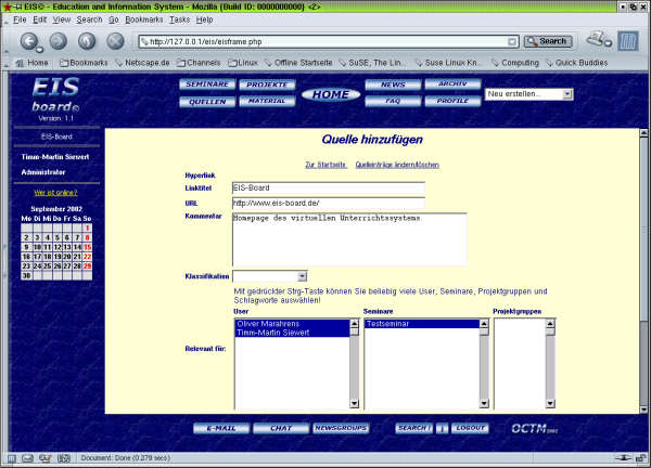 Genau dies tut nun der Anbieter eines Seminares: er publiziert einen Link, der für sein Seminar relevant ist. Dazu wählt er im Dropdownmenu "Neu erstellen..." die Option "Quellen" und entscheidet sich hier für die Eingabe eines neuen Links. Relevant ist dieser Link für sein Seminar "Testseminar", was er in den Relevanzkreisen angibt.