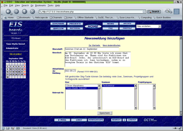 Zur Unterstützung des Unterrichts kann ein Lehrender z.B. auch einen themenspezifischen Chat anbieten. Dazu legt er einen Termin fest und veröffentlicht ihn über das Newsboard für die Relevanzgruppe des Seminares, zu dem der Chat angeboten werden soll.